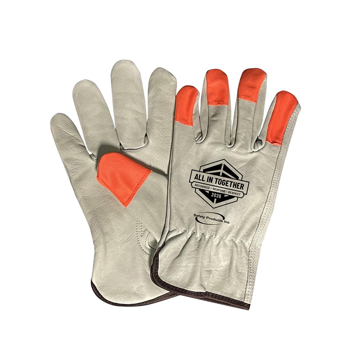 Standard grain cowhide with high visibility orange fabric fingertips. Unlined with shirred elastic back and keystone thumb. 10 dozen per case.